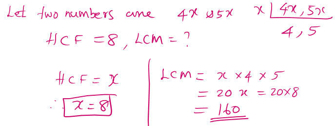 இரு எண்கள் 4:5 என்ற விகிதத்தில் உள்ளது மற்றும் அவற்றின் மீ.பொ.வ 8 எனில் மீ.சி.ம காண்க. (The ratio of two numbers is 4 : 5 and their H.C.F. is 8. Then their L.C.M. is )