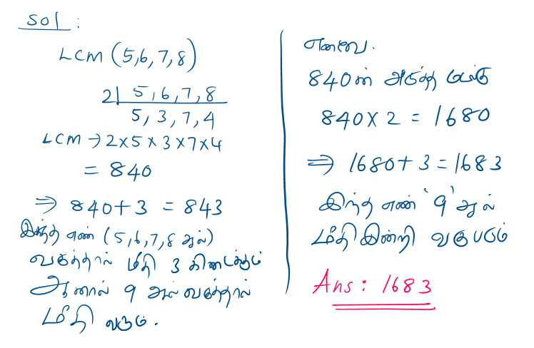 எந்த எண்ணை 5, 6, 7 மற்றும் 8 கொண்டு வகுத்தால் மீதி 3 எனக் கிடைக்கும் மற்றும் 9-ஐ கொண்டு வகுத்தால் மீதி கிடைக்காது.