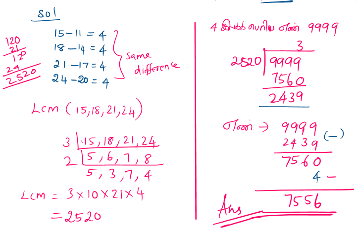 எந்த மிகப்பெரிய நான்கிலக்க எண்ணை 15, 18, 21 மற்றும் 24 ஆல் வகுக்க மீதி முறையே 11, 14, 17 மற்றும் 20 எனக் கிடைக்கும்.