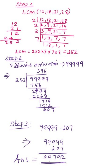 12, 18, 21 மற்றும் 28 ஆல் வகுபடும் மிகப்பெரிய ஐந்திலக்க எண் எது