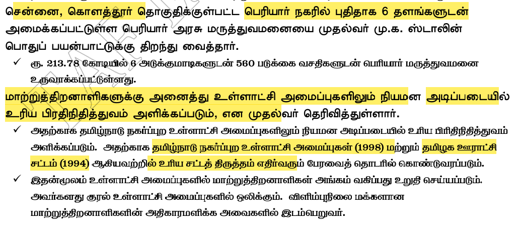 - தமிழ்நாடு பருவநிலை மாற்ற இயக்கத்தின் சார்பில், ‘காலநிலைக்கு ஏற்ற வாழ்க்கை முறை‘ எனும் புத்தகத்தை முதல்வர் மு.க. ஸ்டாலின் வெளியிட்டார்.