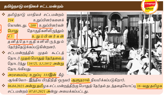 தமிழ்நாடு மாநிலச் சட்டமன்றத்தில் எத்தனை உறுப்பினர்கள் முறையே பொதுத்தொகுதியிலிருந்தும், தனித்தொகுதியிலிருந்தும் தேர்ந்தெடுக்கப்படுகின்றனர்?