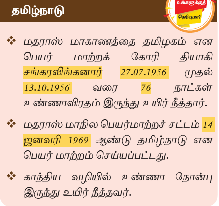 - சங்கரலிங்கனார் காந்திய வாதியும் இந்திய விடுதலைக்காக போராடிய தமிழ் வீரரும் ஆவார்.